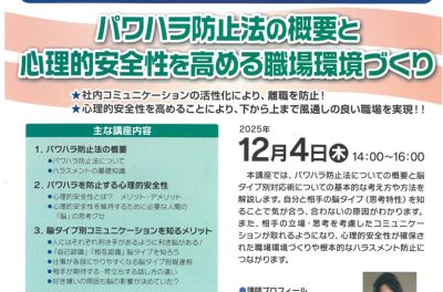 イベント情報 HOMEイベント情報 イベント情報 Category > すべてのカテゴリー その他 Archives >すべて 2025年11月 2025.11.27 1/8(木)富岡地域経済団体会員新年会開催について その他 2025.11.04 12/4(木)『パワハラ防止法の概要と心理的安全性を高める職場環境づくり』セミナー開催のご案内 その他